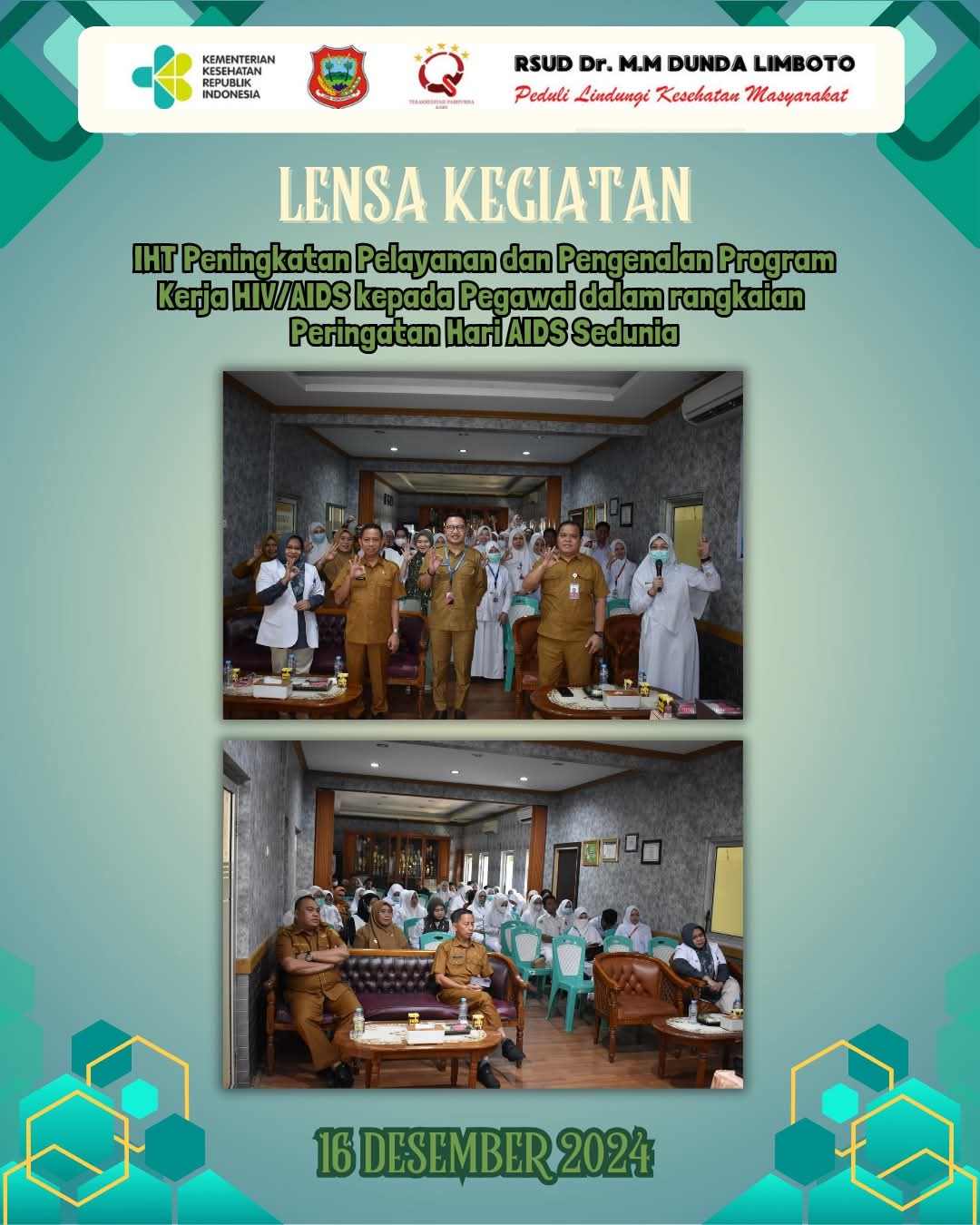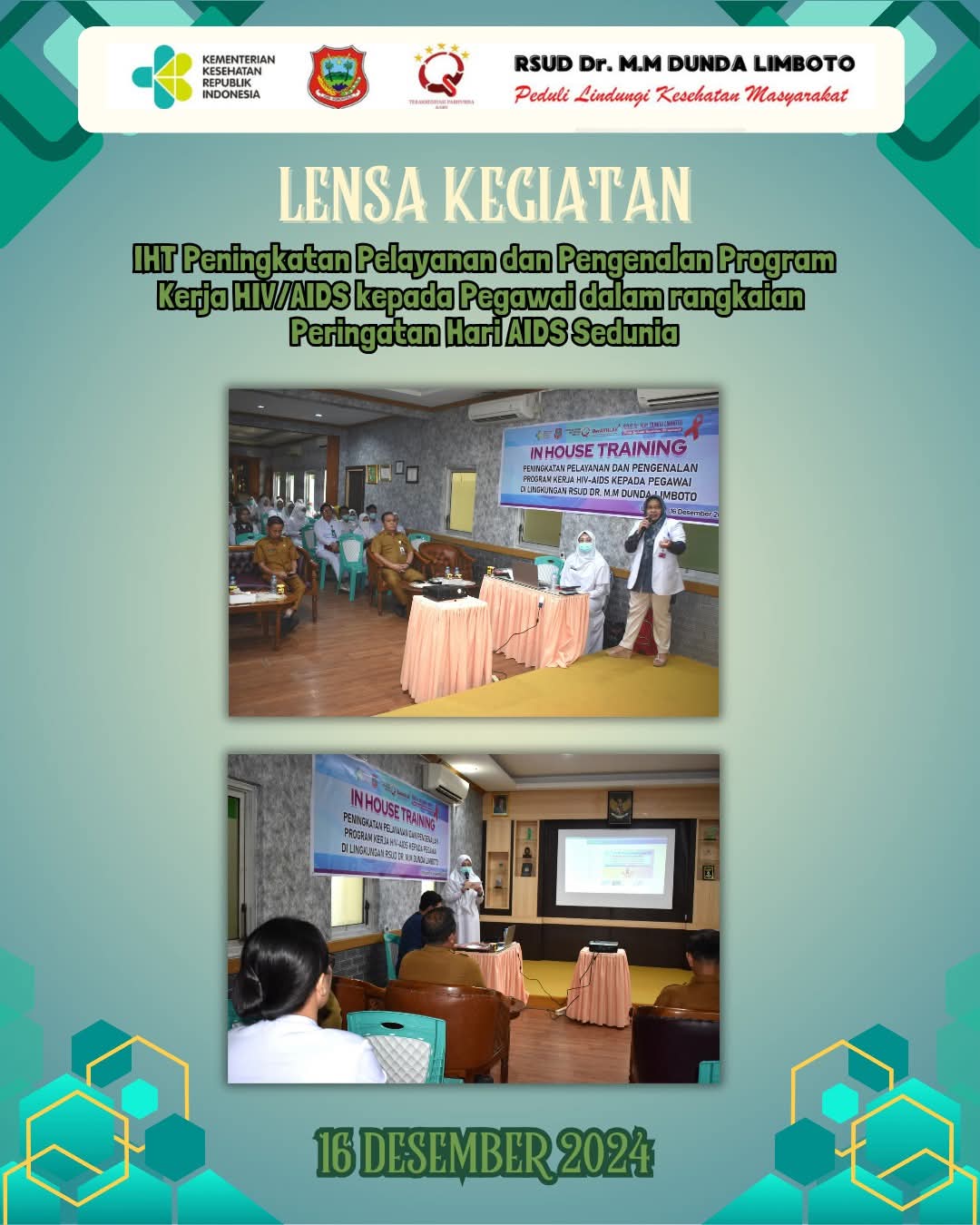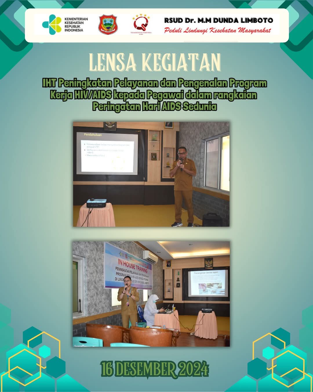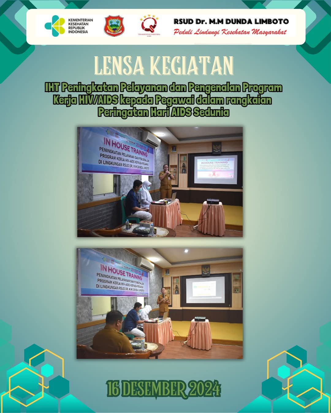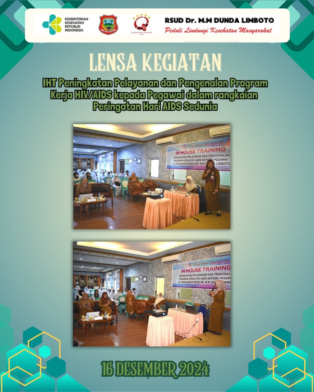 Limboto- 16 Desember 2024, Dalam rangka memperingati Hari AIDS Sedunia, RSUD Dr.M.M Dunda Limboto menggelar In House Training (IHT) bertema "Peningkatan Pelayanan dan Pengenalan Program Kerja HIV/AIDS kepada Pegawai." Acara ini bertujuan meningkatkan kewaspadaan tenaga kesehatan (nakes) terhadap risiko penularan dan pajanan HIV/AIDS dalam pelayanan kesehatan.