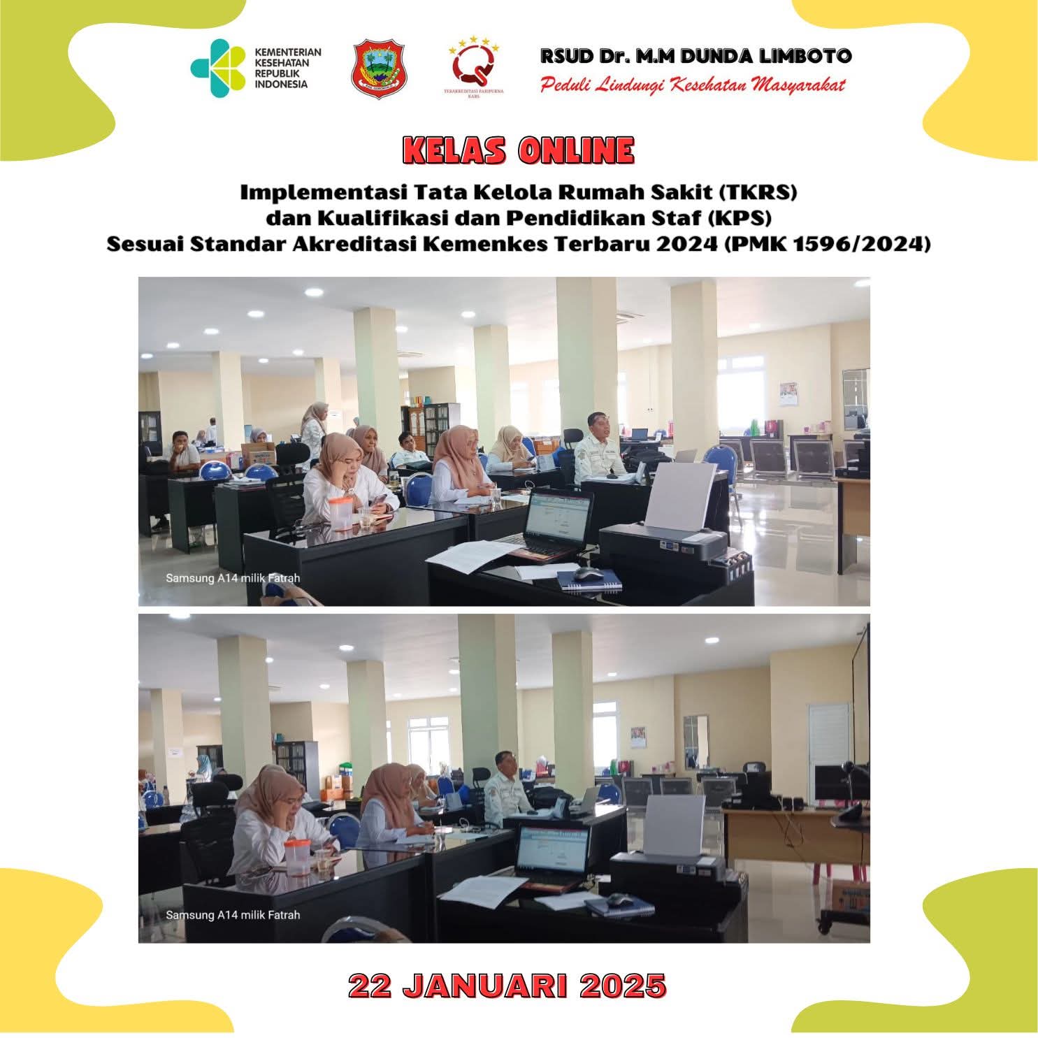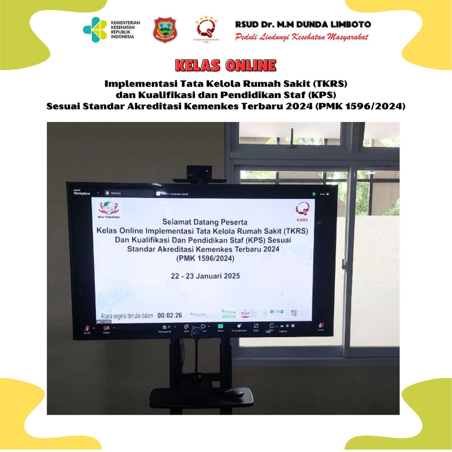 Kegiatan Kelas Online Implementasi Tata Kelola Rumah Sakit TKRS dan Kualifikasi dan Pendidikan Staf KPS Sesuai Standar Akreditasi Kemenkes Terbaru 2024 PMK 1596/2024, 22-23 Januari 2025
